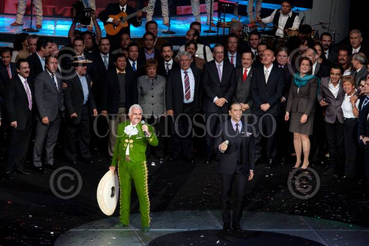 MÉXICO, D.F., 07NOVIEMBRE2010.- Sergio Sarmiento y Carlos Loret de Mola, periodistas, fueron los conductores de la final de Iniciativa México, la cual se realizó en el Auditorio Nacional con la asitencia de comunicadores, empresarios y políticos del país. En la imagen de izquierda a derecha; Emilio Azcárraga Jean, presidente de Grupo Televisa; Alejandro y Vicente Fernández, cantantes de música ranchera; Ricardo Salinas Pliego, presidente de Grupo Salinas; Juan Francisco Ealy Ortiz, presidente del Consejo de Administración del periódico El Universal; Rogerio Azcárraga Madero, director de Radio Formula y Francisco González, presidente de Multimedios. FOTO: MISAEL VALTIERRA/CUARTOSCURO.COM