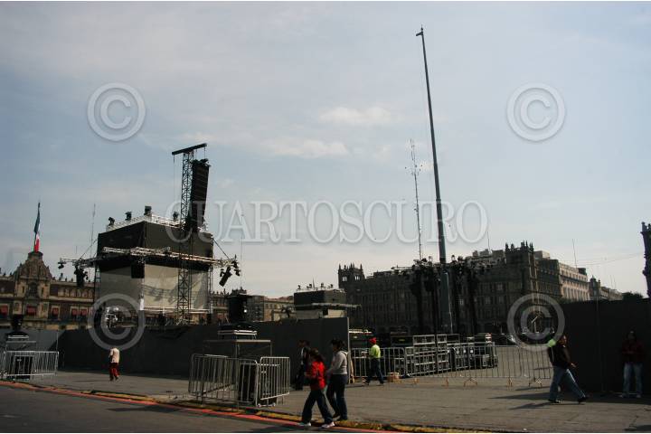 MÉXICO D.F., 08NOVIEMBRE2010.- La plancha del Zócalo, es preparada con el montaje de escenarios, luces y sonido, para el festejo del Centenario de la Revolución Mexica, para lo cual fue arriada la bandera monumental que normalmente permanece en el asta bandera del Zócalo. FOTO: GUILLERMO PEREA/CUARTOSCURO.COM