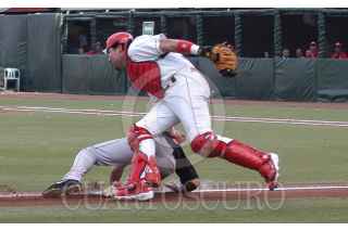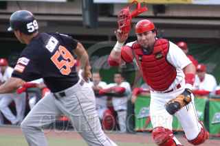 MEXDF30ABRIL2004.- El receptor de los Diablos Saúl Soto pone fuera a Luis Garcia de los Tigres. En el foro Sol inicio la serie Diablos Rojos del México contra los Tigres del Puebla. FOTO: Germán Romero/CUARTOSCURO.COM
