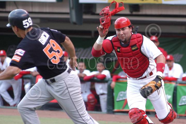 MEXDF30ABRIL2004.- El receptor de los Diablos Saúl Soto pone fuera a Luis Garcia de los Tigres. En el foro Sol inicio la serie Diablos Rojos del México contra los Tigres del Puebla. FOTO: Germán Romero/CUARTOSCURO.COM