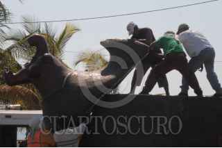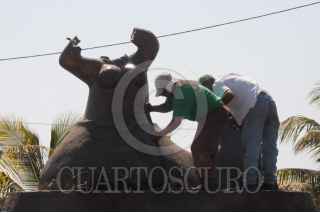ACAPULCO, GUERRERO, 11NOVIEMBRE2010.- La escultura que lleva por nombre "La Sirena Costeña" ubicada en el puerto, fu encontrada sin cabeza y manos por lo que personal de imagen urbana fue el encargado de retirar la escultura del lugar para ser reparada y evitar que la gente la observara en esas condiciones. FOTO: BERNANDINO HERNANDEZ/CUARTOSCURO.COM