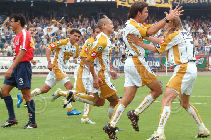 MÉXICO, D. F. 02MAYO2004.- Los Pumas de la UNAM derrotaron 6 goles por 1 a los Tiburones de Veracruz en la continuación de la jornada 17 del torneo de clausura 2004 en el estadio universitario. En la gráfica Leandro Augusto, Francisco Fonseca y Gerardo Galindo festejan la anotación de uno de los goles. FOTO:Iván Stephens/CUARTOSCURO.COM