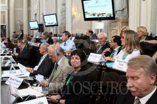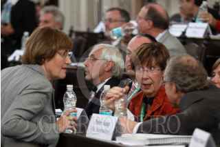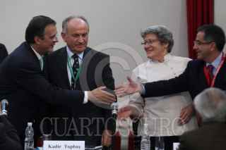 MÉXICO, D.F.,17NOVIEMBRE2010.-Marcelo Ebrard, jefe de gobierno del Distrito Federal, Kadir Topbas de Istambul, Turquia; Elizabeth Gateau de UCLG y Augusto Barrera de Quito, Ecuador durante la inauguración del Bureau Ejecutivo del Congreso Mundial de Líderes Locales y Regionales 2010 (CGLU) el cual se realizo en el Palacio de Mineria. FOTO: RODOLFO ANGULO/CUARTOSCURO.COM