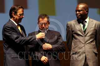 MÉXICO, D.F., 19NOVIEMBRE2010.- Marcelo Ebrard, jefe de gobierno del Distrito Federal; Augusto Barrera, alcalde de Quito, Ecuador y Khalifa Sall, alcalde de Dakar, Senegal durante la plenaria "La Ciudad de 2030" que se realizo como parte de las actividades de la Cumbre Mundial de Líderes Locales y Regionales 2010 que se realizo en el Teatro Metropolitan. FOTO: RODOLFO ANGULO/CUARTOSCURO.COM
