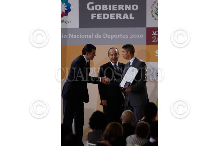 MÉXICO, D.F., 20NOVIEMBRE2010.- Joakim Agustín Soria Ramos, Teócrito Arteaga Nochebuena, Alonso Lujambio Irazábal, Secretario de Educación Pública; Felipe "Tibio" Muñoz, Bernardo de la garza, titular de la CONADE; Paola Michelle Longoria, Juan René Serrano Gutiérrez, durante la entrega del premio Nacional del Deporte. FOTO: IVAN STEPHENS/CUARTOSCURO.COM