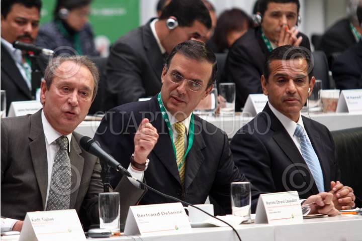 MÉXICO, D.F., 21NOVIEMBRE2010.- Marcelo Ebrard, jefe de gobierno de Distrito Federal conversa con alcades de ciudades de África durante un receso en la sesión plenaria de la Cumbre Mundial de Alcaldes sobre Cambio Climático que se realiza en el Palacio de la Escuela de Medicina. FOTO: RODOLFO ANGULO/CUARTOSCURO.COM