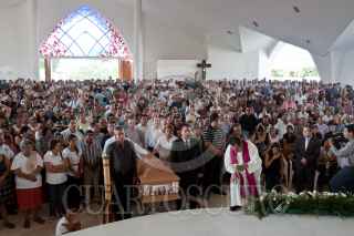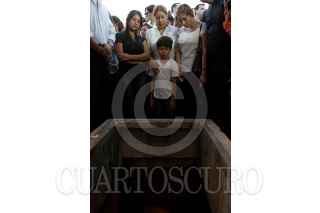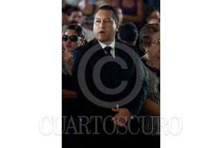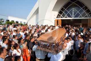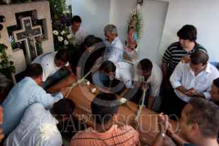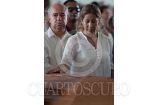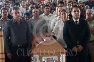 TECOMAN, COLIMA, 22NOVIEMBRE2010.- Idalia González Pimentel, viuda de Cavazos observa el féretro de su esposo Silverio Cavazos Ceballos (1968-2010) durante la guardia de honor en la misa al ex mandatario que se ofreció en el Templo de Santo Santiago Apóstol ubicado en este municipio. El ex gobernador fue asesinado el día de ayer por tres disparos de arma de fuego afuera de su casa. FOTO: MISAEL VALTIERRA/CUARTOSCURO.COM