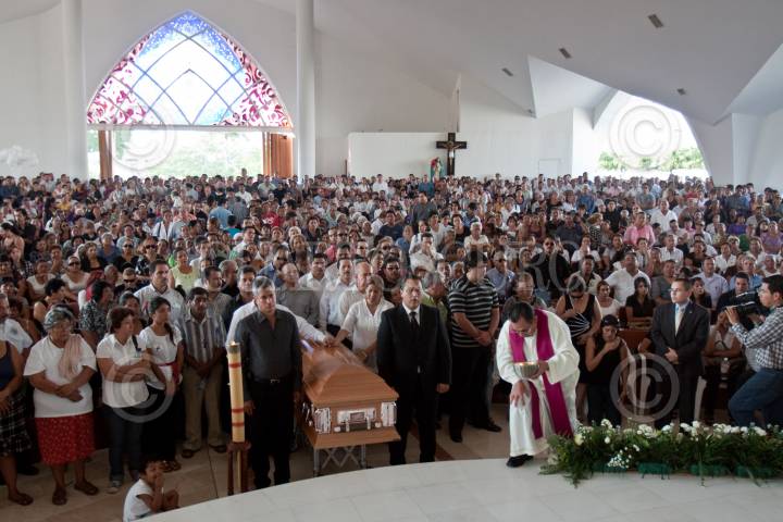 TECOMAN, COLIMA, 22NOVIEMBRE2010.- Idalia González Pimentel, viuda de Cavazos observa el féretro de su esposo Silverio Cavazos Ceballos (1968-2010) durante la guardia de honor en la misa al ex mandatario que se ofreció en el Templo de Santo Santiago Apóstol ubicado en este municipio. El ex gobernador fue asesinado el día de ayer por tres disparos de arma de fuego afuera de su casa. FOTO: MISAEL VALTIERRA/CUARTOSCURO.COM