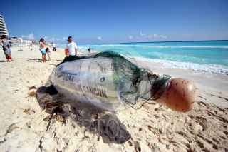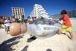 CANCÚN, QUINTANA ROO, 28NOVIEMBRE2010.- Un mensaje en una botella para los representantes de los países que participarán en la Cumbre de Cambio Climático fue colocado por ONGS en la playa. FOTO: AMARANTA PRIETO/CUARTOSCURO.COM