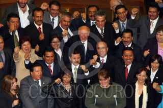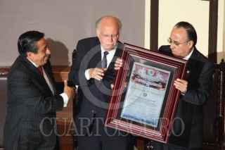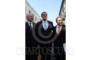 PUEBLA, PUEBLA, 30NOVIEMBRE2010.- José Narro Robles, rector de la UNAM, junto a Rafael Moreno Valle Rosas, gobernador electo estatal; y el rector de la BUAP, Enrique Agüera Ibañez, a su llegada a la sede del congreso del estado. El representante de la máxima casa de estudios recibió un reconocimiento por parte de los legisladores poblanos con motivo del primer centenario de vida institucional de la universidad. FOTO: FRANCISCO GUASCO/CUARTOSCURO.COM