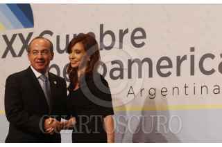 MAR DE PLATA, ARGENTINA, 03DICIEMBRE2010.- Felipe Calderón, Presidente de los Estados Unidos Mexicanos, durante el saludo protocolario con Cristina Fernandez De Kirchner, Presidenta de Argentina, en la ceremonia de inaguración de la XX cumbre Iberoamericana. FOTO: ALFREDO GUERRERO/CUARTOSCURO.COM