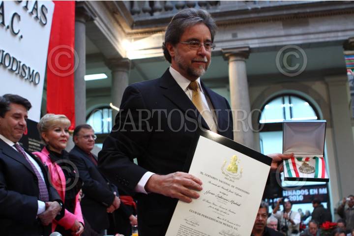 MÉXICO, D.F., 08DICIEMBRE2010.- Miguel Cantón Zetina, director editorial del Grupo Cantón, recibió el premio nacional de periodismo del XL Certamen Nacional de Periodismo, que le fue entregado a el periódico Tabasco Hoy por su cobertura de nacional durante las inundaciones que asolaron a esta entidad a lo largo de 38 días, en el Club de Periodistas. FOTO: MOISÉS PABLO/CUARTOSCURO.COM