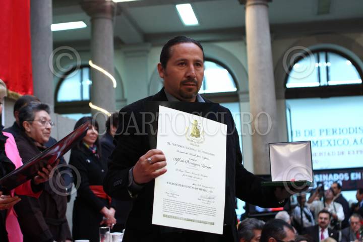 MÉXICO, D.F., 08DICIEMBRE2010.- Miguel Cantón Zetina, director editorial del Grupo Cantón, recibió el premio nacional de periodismo del XL Certamen Nacional de Periodismo, que le fue entregado a el periódico Tabasco Hoy por su cobertura de nacional durante las inundaciones que asolaron a esta entidad a lo largo de 38 días, en el Club de Periodistas. FOTO: MOISÉS PABLO/CUARTOSCURO.COM