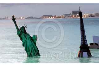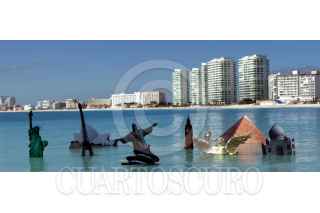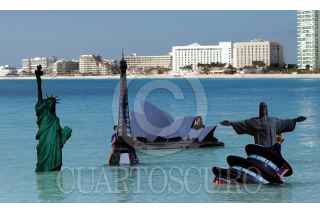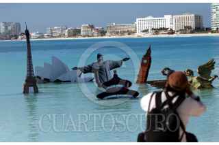 CANCÚN, QUINTANA ROO, 08DICIEMBRE2010.- Activistas de Greenpeace colocaron en una playa imágenes representativas de diferentes países que participan en la cumbre COP 16 para demostrar los efectos del calentamiento global. FOTO: AMARANTA PRIETO/CUARTOSCURO.COM