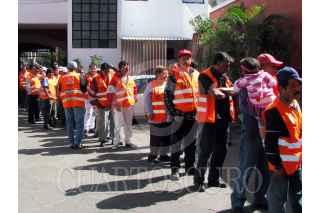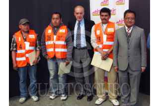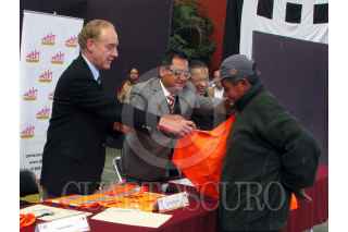 MEXICO, D.F., 13DICIEMBRE2010.- Eduardo Santillán Pérez, jefe delegacional de Alvaro Obregón, Benito Mirón Lince, secretario del trabajo capitalino, durante la entrega de chalecos y permisos a Franeleros de esta ciudad. FOTO: CUARTOSCURO.COM