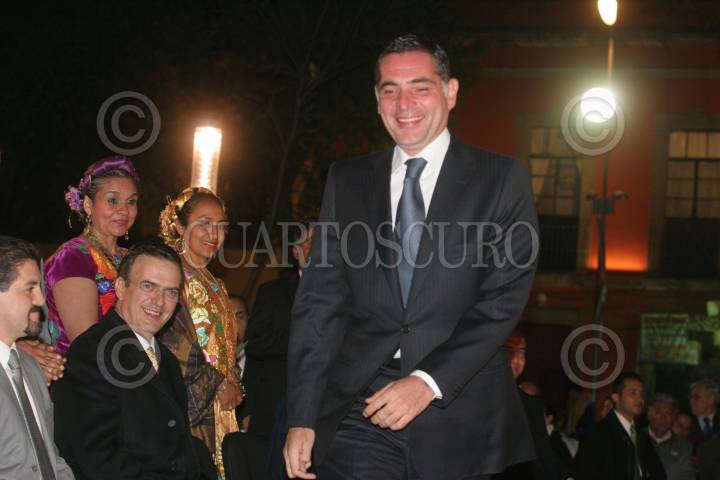 MÉXICO, D.F., 09DICIEMBRE2010.- Marcelo Ebrard, jefe de gobierno local recibe un disco de un cantante de mariachi zacatecano conocido como el "Rebelde" a la salida de la inauguración del museo del Tequila y el Mezcal en la plaza garibaldi. FOTO: SAÚL LÓPEZ/CUARTOSCURO.COM
