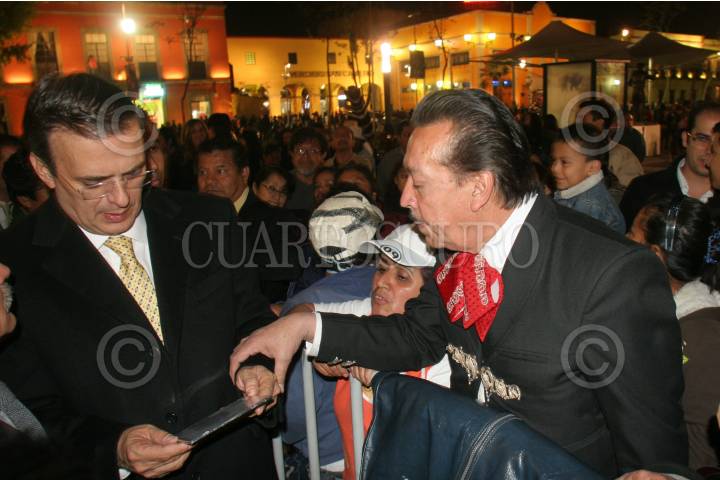 MÉXICO, D.F., 09DICIEMBRE2010.- Marcelo Ebrard, jefe de gobierno local recibe un disco de un cantante de mariachi zacatecano conocido como el "Rebelde" a la salida de la inauguración del museo del Tequila y el Mezcal en la plaza garibaldi. FOTO: SAÚL LÓPEZ/CUARTOSCURO.COM