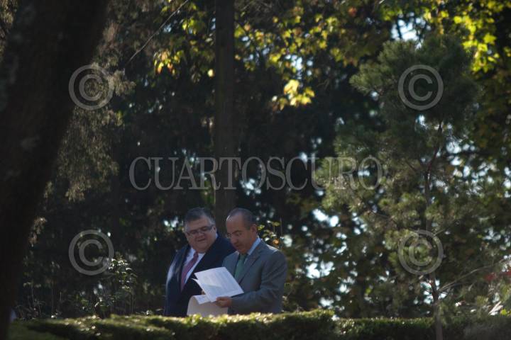 MÉXICO, D.F., 14DICIEMBRE2010.- Agustin Carstens Carstens, gobernador del Banco de México; Dominique Strauss-Kahn, director gerente del Fondo Monetario Internacional, y Felipe de Jesús Calderón Hinojosa, presidente de México; estuvieron presentes en la Residencia oficial de Los Pinos para anunciar la ampliación de crédito a México por 73 mil millones de dólares. FOTO: IVAN STEPHENS/CUARTOSCURO.COM