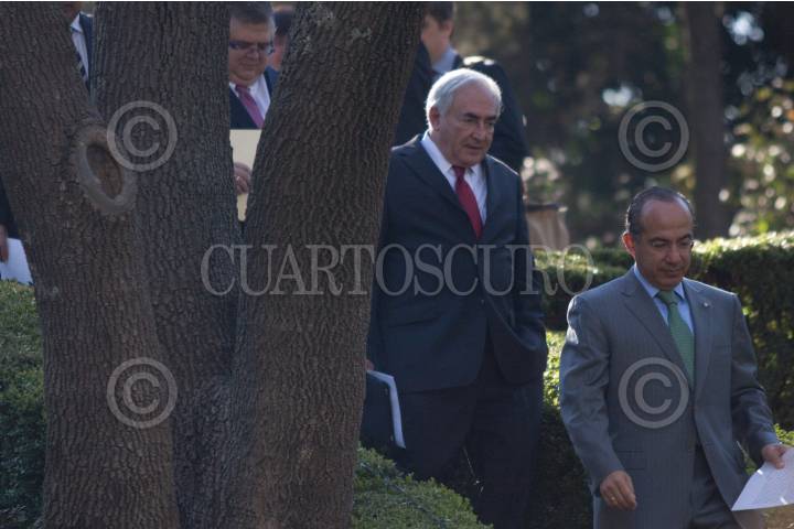 MÉXICO, D.F., 14DICIEMBRE2010.- Agustin Carstens Carstens, gobernador del Banco de México; Dominique Strauss-Kahn, director gerente del Fondo Monetario Internacional, y Felipe de Jesús Calderón Hinojosa, presidente de México; estuvieron presentes en la Residencia oficial de Los Pinos para anunciar la ampliación de crédito a México por 73 mil millones de dólares. FOTO: IVAN STEPHENS/CUARTOSCURO.COM