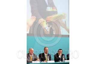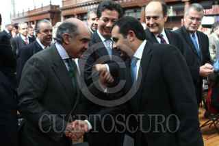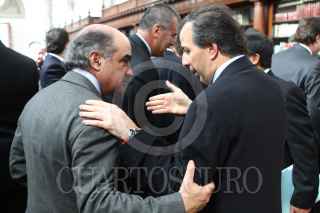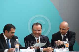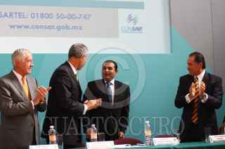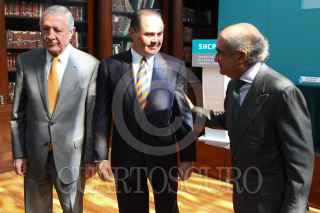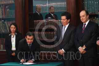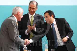 MÉXICO, D.F., 16DICIEMBRE2010.- José Andrés de Oteyza, Luis Alberto Harvey, saludaron a Luis Téllez, director de la Bolsea Mexicana de Valores, al finalizar la firma del acuerdo "tuafore, tuganancia" en el Palacio Nacional. FOTO: MOISÉS PABLO/CUARTOSCURO.COM