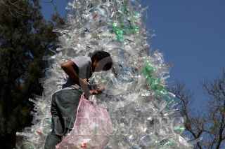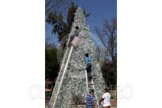 MÉXICO, D.F., 18DICIEMBRE2010.- Jóvenes terminan un árbol de navidad de 10 metros de altura el cual esta cubierto con botellas de PET, el cual contará con iluminación de leds y que a su vez estará conectado a una planta de luz que será alimentada con biodiesel, este árbol se encuentra en la explanada del Jardín Botánico del Bosque de Chapultepec. FOTO: RODOLFO ANGULO/CUARTOSCURO.COM