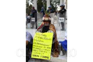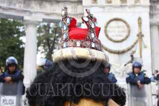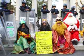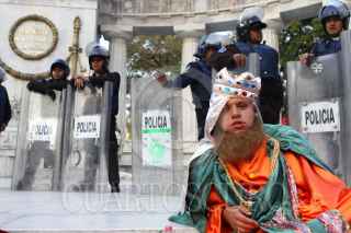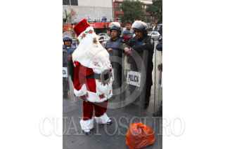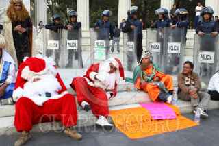 MÉXICO, D.F., 18DICIEMBRE2010.- Comerciantes que cada año se disfrazan de santa clos y reyes magos se manifestaron en el Hemiciclo a Juárez por que esta temporada aún el gobierno capitalino no les ha asignado un lugar para que se trabajen. Es toda una tradición para los defeños acudir a la Alameda Central y tomarse la foto con estos personajes navideños, sin embargo, todo indica que este 2010 no se contará con esta festividad. Apenas el día de ayer se colocó una feria sobre avenida Hidalgo lugar que en épocas pasadas se utilizó para esta actividad. Los manifestantes fueron encapsulados por granaderos, aunque muchos niños aprovecharon para saludarlos. FOTO: MOISÉS PABLO/CUARTOSCURO.COM