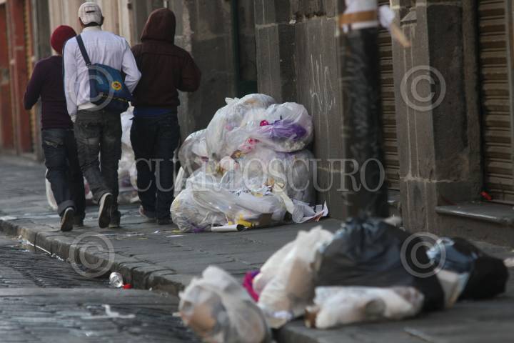PUEBLA, PUEBLA, 01ENERO2011.- Sobre las calles de la ciudad se encontraron centenares de bolsas de basura, resultado de los festejos de año nuevo. El servicio de limpia dejó acumulado los deshechos debido a que no laboraron en los días festivos. FOTO: FRANCISCO GUASCO/CUARTOSCURO.COM