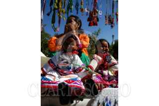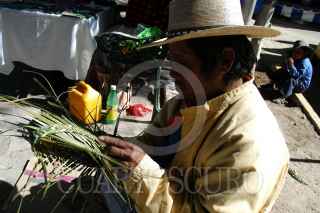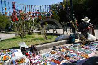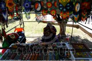 MEZQUITIC, JALISCO, 02ENERO2011.- Durante la feria del pueblo, indigenas wixarikas, vende su trabajo tradicional en el jardín principal. Los huicholes conservan una viva tradición artesanal, además de, pulseras, aretes y collares, hacen obras de arte con escultura, pues tallan en madera figuras de deidades y animales sagrados y se adornan con mosaico de chaquira. Ubicada al norte del estado, en la sierra Madre Occidental, este municipio es parte de los del pueblos indigenas Wixarika. Los también llamados Huicholes, tiene presencia a lo largo de cuatro estados (Jalisco, Zacatecas, Nayarit y Durango) en los que abarca su territorio cultural, aunque la población más numerosa radica en Jalisco. FOTO: ADOLFO VALTIERRA/CUARTOSCURO.COM