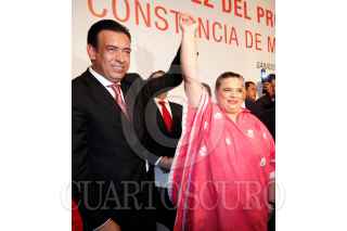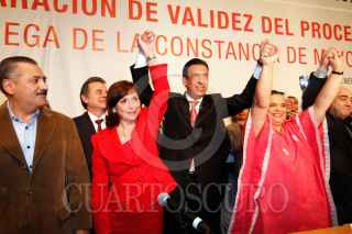 MÉXICO, D.F., 08ENERO2011.- Los priistas Manlio Fabio Beltrones, Cristina Díaz, Humberto Moreira, Beatriz Paredes y Jesús Murillo Karam, alzan las manos victoriosos después de que el que fuera gobernador de Coahuila recibió la constancia de mayoría como nuevo dirigente nacional del PRI. FOTO: CUARTOSCURO.COM