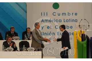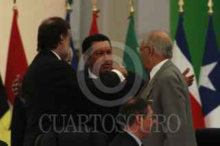 GUADALAJARA, JALISCO 28MAYO2004.- El presidente de Venezuela, Hugo Chavez, es saludo antes de la inauguración de la Tercera Cumbre América Latina y el Caribe-Unión Europea. FOTO: Germán Romero/CUARTOSCURO.COM