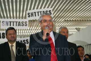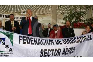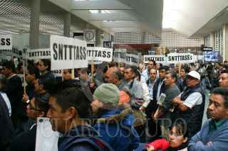 MÉXICO D.F., 12ENERO2010.- Miguel Ángel Lúdico Colín, Secretario General del Sindicato Nacional de Trabajadores de Transportes, Transportación, Aviación, Servicio y Similares, encabezo la manifestación de trabajadores pertenecientes a este sindicado los cuales laboran para Mexicana de Aviación, Mexicana Clik y Mexicana Link, los cuales demandaron el pronto reestablecimiento de operaciones de esta aerolínea, esto en la Teminal 2 del Aeropuerto Internacional. FOTO: GUILLERMO PEREA/ CUARTOSCURO.COM