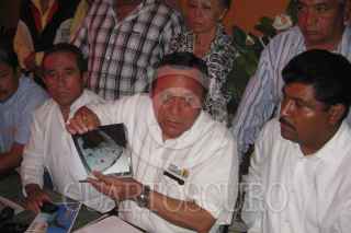 CHILPANCINGO, GUERRERO, 12NERO2011.- Jesús Zambrano, coordinador de la campaña de la coalición "Guerrero nos Une" acompañado por del dirigente estatal del PRD, Misael Medrano Baza y por el dirigente estatal del PT, Fredy García Guevara y de militantes perredistas, condeno la agresión física que sufrió el representante de dicha coalición ante el Instituto Electoral del Estado de Guerrero (IEEG) Guillermo Sánchez Nava, que se suscito la noche del martes, al acudir cerca del Palacio de Gobierno después de recibir una llamada anónima, en la que le hacían saber que algunas personas estaban retirando propagada del candidato a gobernador Ángel Aguirre Rivero, donde sufrió la agresión que lo mantiene sumamente grave debido a un derrame cerebral y fractura de cráneo ocasionados por los golpes que recibió por personas desconocidas y supuestos simpatizantes del candidato a gobernador por la coalición "Tiempos Mejores para Guerrero" Manuel Añorve Baños. En la imagen muestran fotografías de las condiciones en las que quedo el vehiculo en el que se transportaba el agredido así como cuando era traslado en una ambulancia luego de quedar inconsciente. FOTO: OSCAR ALVARADO/CUARTOSCURO.COM