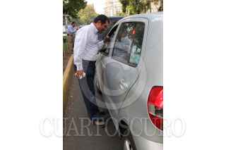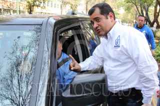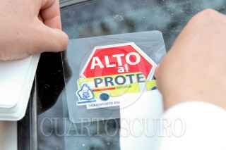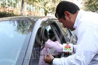 MÉXICO, D.F., 14ENERO2011.- Obdulio Ávila, dirigente local del Partido Acción Nacional, repartió calcomanías con la leyenda "Alto al PROTE" a los automovilistas que circulaban por la calle de Homero en la colonia Polanco. Este programa obliga a las escuelas al transporte escolar obligatorio. FOTO: MOISÉS PABLO/CUARTOSCURO.COM