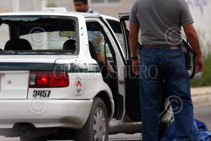 CANCÚN, QUINTANA ROO, 18ENERO2011.- El enfrentamiento entre sicarios y elementos de la Policía Judicial de Quintana Roo, en el fraccionamiento Paraíso Maya, dejó como saldo la muerte del presunto jefe de un grupo del crimen organizado, conocido con el alias de El Memín. Los agentes policíacos, apoyados por efectivos del Ejército Mexicano, realizaban un operativo en el fraccionamiento, para cercar a El Memín, quien trató de fugarse y se resistió a la captura. El presunto sicario disparó desde el interior de un taxi, con placas 3457, en contra de los elementos de la Judicial y los militares, pero fue abatido por ellos durante el tiroteo. En la balacera resultó herido otro presunto delincuente, apodado como El Flaco, quien recibió un rozón y dos impactos de bala en un brazo. Éste, junto con otros dos, fueron detenidos. FOTO: AMARANTA PRIETO/CUARTOSCURO.COM