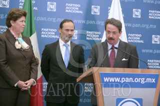 MÉXICO, D.F., 19ENERO2011.- Cecilia Romero Castillo, secretaria general ,Gustavo Madero Muñoz, presidente nacional del PAN, y Juan Molinar Horcasitas, recién nombrado Secretario Técnico de la Comisión Política del partido, ofrecieron una conferencia de prensa en la sede del blanquiazul. FOTO: CUARTOSCURO.COM