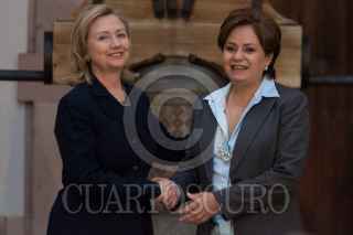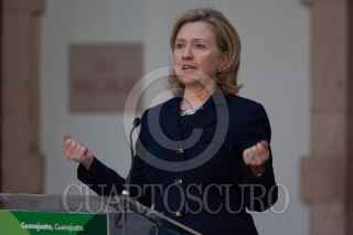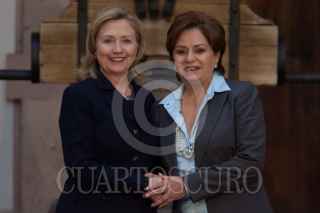 GUANAJUATO,GUANJUATO, 24ENERO2011.- Hilary Clinton secretaria de Estado de EE.UU. y Patricia Espinosa canciller mexicana se reunieron en privado en la Aloniga de Granaditas, donde trataron temas relacionados con el crimen organizado, la cooperación bilateral, cambio climático, entre otros. Posteriormente se reunieron con la prensa acreditada donde Clinton hizo elogios al trabajo de Méxcio en el combate al narcotráfico y se reusó a hablar sobre las filtraciones de Wikyleaks. FOTO: DEMIAN CHÁVEZ/CUARTOSCURO.COM