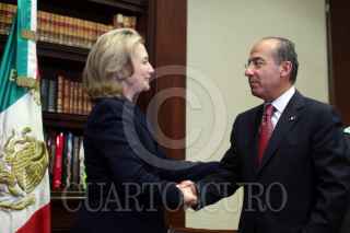 MÉXICO, D.F., 24ENERO2011.- Hillary Clinton, secretaria de Estado de Estados Unidos de Norteamerica y Felipe Calderón Hinojosa, presidente de México, se saludan durante una reunión en la Residencia Oficial de Los Pinos. FOTO: ALFREDO GUERRERO/CUARTOSCURO.COM