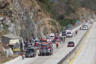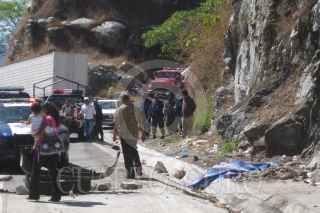 TIERRA COLORADA, GUERRERO, 25ENERO2011.- Un muerto, tres personas lesionadas de gravedad y cuantiosos daños materiales, fue el saldo que dejo un accidente automovilístico registrado sobre la Autopista del Sol a la altura del municipio de Juan R. Escudero (Tierra Colorada) cuando un trailer embistiera a dos camionetas que se encontraban paradas debido a un bloqueo que realizaban campesinos indígenas sobre esta arteria para exigir solución a diversas demandas. FOTO: OSCAR ALVARADO/CUARTOSCURO.COM