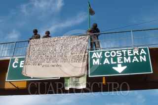 ACAPULCO, GUERRERO, 28ENERO2011.- Alrededor de las 8 de la mañana fueron colocadas 2 narco mantas en diferentes puntos de acapulco la primera en la carretera México-Acapulco en el puente peatonal de la colonia Benito Juárez y la otra en el puente Bicentenario en la Cuauhtémoc estuvieron colgadas en un lapso de 20 minutos y después el Ejercito Mexicano las retiro. FOTO: URIEL SÁNCHEZ/CUARTOSCURO.COM