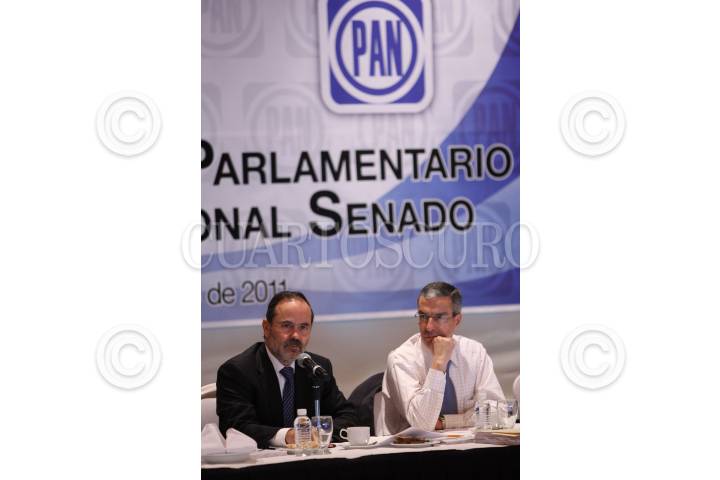 MÉXICO, D.F., 28ENERO2011.- Gustavo Madero, dirigente nacional del PAN y José González Morfín, coordinador de los senadores panistas, ofrecieron una conferencia de prensa tras concluir su reunión plenaria. FOTO: CUARTOSCURO.COM