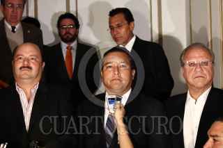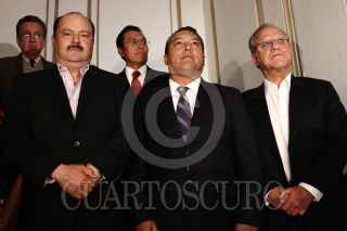 MEXICO, D.F., 28ENERO2011.- Cesar Duarte, Gobernador del Estado de Chihuahua; Francisco Blake Mora, Secretario de Gobernación y Héctor Murguía Lardizábal, presidente municipal de Ciudad Juárez; ofrecieron un mensaje a los medios de comunicación, donde informaron sobre los acuerdos que se realizaron después de la reunión privada que sostuvieron estos funcionarios en la sede central de la Secretaría de Gobernación. FOTO: MISAEL VALTIERRA/CUARTOSCURO.COM