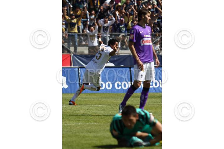 MÉXICO, D.F., 30ENERO2011.- Sergio Perez de los Rayados del Monterrey pelea el balón con Leandro Augusto de los Pumas de la UNAM durante el encuentro que se realizo en el Estadio Olímpico Universitario de la jornada 4 del Torneo Clausura 2011 del fútbol mexicano en donde los Pumas vencieron 3 goles por 2 a los Rayados. FOTO: RODOLFO ANGULO/CUARTOSCURO.COM
