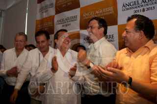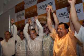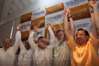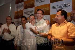 ACAPULCO GUERRERO, 30ENERO2011.- Ángel Aguirre, candidato de la Coalición “Guerrero nos Une” acompañado de Manuel Camacho Solís, Coordinador del Día, Jesús Ortega, Presidente Nacional del PRD, Marcelo Ebrard Casaubon, Jefe de Gobierno Capitalino, Luis Walton, Presidente de Convergencia y Jesús Zambrano Diputado Federal del PRD, dieron a conocer la virtual victoria en la contienda electoral para gobernador del estado de Guerrero. FOTO: GUILLERMO PEREA/CUARTOSCURO.COM