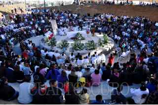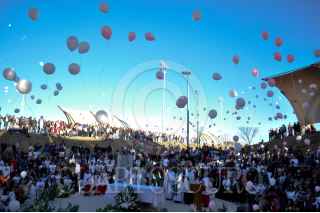 CIUDAD JUAREZ, CHIHUAHUA, 30ENERO2011.- Esta tarde cientos de familias se congregaron en las instalaciones deportivas que construyó el gobierno federal, lugar en donde se ofició una misa encabezada por el Obispo Don Renato Asencio León y los familiares de las victimas que fueron ejecutadas en Villas de Salvarcar. En este renglón el representante de la Iglesia Católica en Ciudad Juárez, manifestó que con la visita de la primera dama del país se hizo entrega de material deportivo, sin embargo esta misa es para darles el adiós a estos jóvenes que en manos criminales perdieron la vida. FOTO: NACHO RUIZ/CUARTOSCURO.COM
