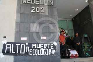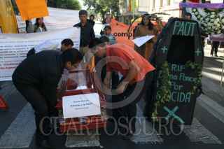 MÉXICO, D.F., 01FEBRERO2011.- Vecinos y simpatizantes de la colonia Malinche se manifestaron en el edificio de la Procuraduría Ambiental y del Ordenamiento Territorial del DF, en donde señalaron que la obra de la Supervía representa un ecocidio en la zona, para su protesta los manifestantes llevaron un ataúd. FOTO: MOISÉS PABLO/CUARTOSCURO.COM