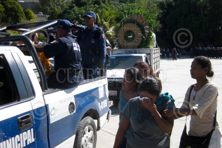 CHILPANCINGO, GUERRERO, 03FEBRERO2011.- Homenaje póstumo que le fue rendido en el cuartel de la Secretaria de Seguridad Publica Municipal (SSPM) al comandante de dicha corporación Jose Guadalupe de la Cruz Ruano luego de que fuera asesinado al ser emboscado por un grupo de sujetos fuertemente armados en la comunidad de Palo Blanco municipio de Chilpancingo cuando regresaba después de participar en un operativo donde fue detenido el comisario de la comunidad de El Tejocote con posesión de varios kilos de goma de opio. Cabe mencionar que después del homenaje fue trasladado al panteón nuevo donde fue sepultado, acompañándolo hasta su ultima morada familiares, amigos y compañeros de trabajo. FOTO: OSCAR ALVARADO/CUARTOSCURO.COM