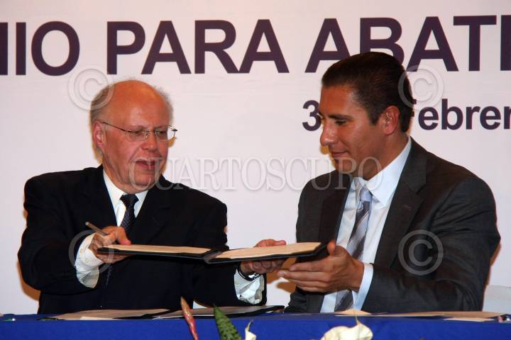 PUEBLA, PUEBLA 03FEBRERO2011.- José Narro Robles, rector de la UNAM y Enrique Agüera Ibañez, rector de la BUAP, firmaron el convenio de colaboración para abatir la analfabetización, ya que aseguran que alrededor de 400 mil poblanos en su mayoría mujeres no saben leer ni escribir. FOTO: FRANCISCO GUASCO/CUARTOSCURO.COM