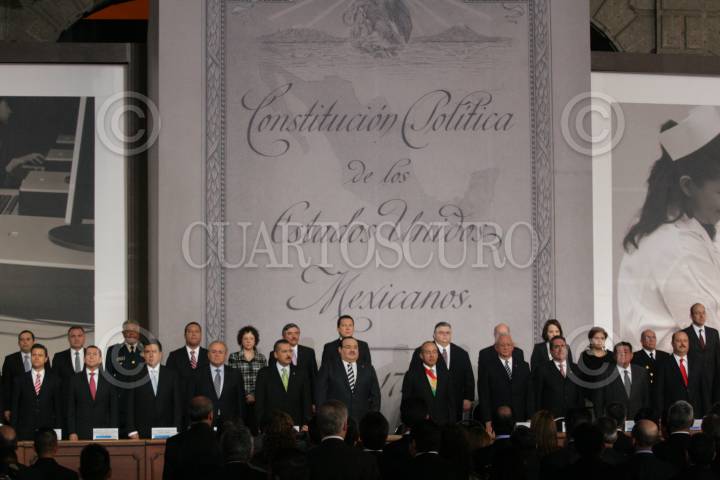 MÉXICO, D.F., 05FEBRERO2011.- Manlio Fabio Beltrones, presidente de la mesa directiva del Senado, Jorge Carlos Ramírez, presidente de la Cámara de Diputados, Felipe Calderón Hinojosa, presidente de los Estados Unidos Mexicanos y Juan N. Silva Meza, presidente de la Suprema Corte Justicia de la Nación, entregaron constituciones mexicanas en diferentes dialectos esto en la ceremonia conmemorativa del 94 aniversario de la promulgación de la Constitución Política de los Estados Unidos Mexicanos de 1917 en el Palacio Nacional. FOTO: RODOLFO ÁNGULO/CUARTOSCURO.COM