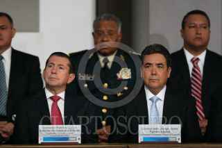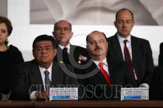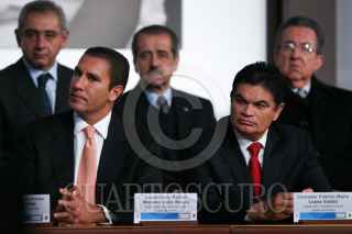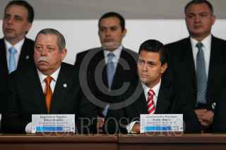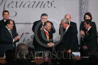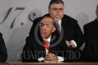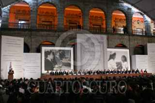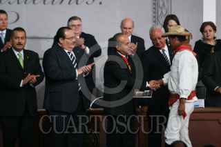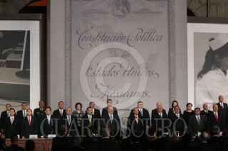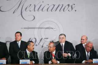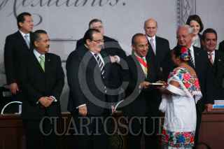 MÉXICO, D.F., 05FEBRERO2011.- Manlio Fabio Beltrones, presidente de la mesa directiva del Senado, Jorge Carlos Ramírez, presidente de la Cámara de Diputados, Felipe Calderón Hinojosa, presidente de los Estados Unidos Mexicanos y Juan N. Silva Meza, presidente de la Suprema Corte Justicia de la Nación, entregaron constituciones mexicanas en diferentes dialectos esto en la ceremonia conmemorativa del 94 aniversario de la promulgación de la Constitución Política de los Estados Unidos Mexicanos de 1917 en el Palacio Nacional. FOTO: RODOLFO ÁNGULO/CUARTOSCURO.COM