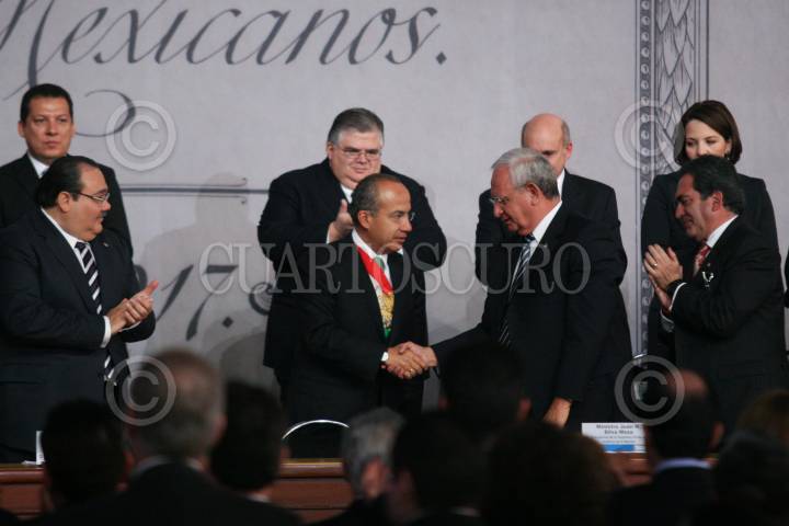 MÉXICO, D.F., 05FEBRERO2011.- Manlio Fabio Beltrones, presidente de la mesa directiva del Senado, Jorge Carlos Ramírez, presidente de la Cámara de Diputados, Felipe Calderón Hinojosa, presidente de los Estados Unidos Mexicanos y Juan N. Silva Meza, presidente de la Suprema Corte Justicia de la Nación, entregaron constituciones mexicanas en diferentes dialectos esto en la ceremonia conmemorativa del 94 aniversario de la promulgación de la Constitución Política de los Estados Unidos Mexicanos de 1917 en el Palacio Nacional. FOTO: RODOLFO ÁNGULO/CUARTOSCURO.COM